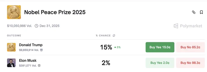 俄乌能停火肯定是利好,说不定老俄罗斯项目 $WAVE 能被拿出来炒作一下。必须结束不等于马上结束,感觉还要拉扯好一会儿。 如果 Trump 真的做到了,那么最大的机会可能是 Polymarket 上2025年诺贝尔和平奖的预测。如果停火,概率应该会升至50%以上。5%—50%,10倍。 https://t.co/4lQHAUZXFa