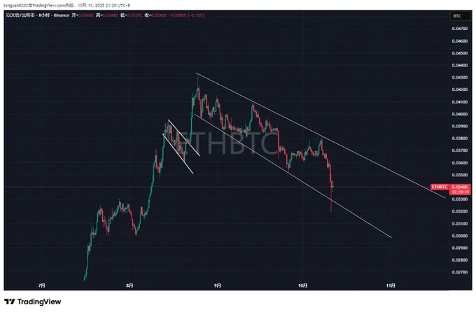 我觉得还是有必要在这里提醒下大家。 因为我个人是多空趋势都做,今天下午又从空头的角度理性的详细看了下盘面。很多最近涨幅较好的山寨都提前出现了【周线级别的空头趋势】,这些山寨的资金往往会提前抢跑。 如果接下来 $BTC 和 $ETH 直接跌穿前文说到的回调支撑位,那么抄底和接多就要小心一些了。可以再耐心些,等右侧企稳。 而这种跌法还是比较清晰干脆的信号,最折磨人的情况是跌到这些支撑位后先产生反弹,让大家以为回调结束,好似开始一轮新的上涨。结果是大级别的下跌反弹,反弹后继续下跌。类似2025年1月份—4月份的阶梯式下跌。 这次的下跌幅度和调整时间可能不会那么久,但是左侧摸底后一旦格局会被不断打损。所以谨慎一些的话,还是等右侧企稳更好一些。 接下来行情最终会怎么走,我目前也无法完全肯定。我个人是找了些出现周线级别空头趋势的山寨又继续开进去空单了。 以上,供参考。