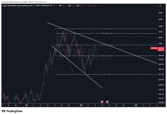 昨天做空的山寨止盈了半仓,剩下的今天都打保本损了。这里的盘面看不太懂,暂时空仓两天。 原本8月3日接多的时候,是看 $ETH 上去做个假突破顶部的,但被中间的震荡洗出去了,这里也先不再追多了。 接下来重点关注 $ETH 的走势,如果能一举强势突破4100的位置,会重新考虑做多。如果在顶部滞涨,会继续逢高做空山寨。 供参考。
