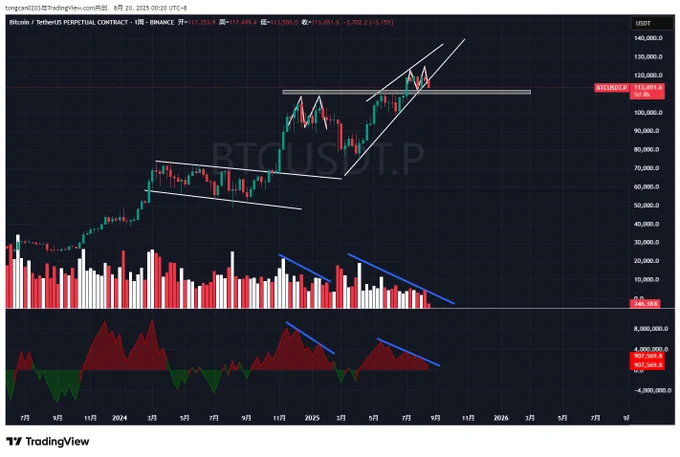 如果我是一个想着一味赚取流量的KOL博主,最聪明的方式就是永远唱多、喊多、分析多头趋势。 因为即便错了,我可以说一句我也赔钱了、被套了,大家都可以共情。 但我是一个想在这里真实记录和分享自己交易思路的交易员。我不能一边自己开空,一边在推特上鼓舞大家坚信回调就是机会,勇敢接多。 简单从我个人的技术层面说一下这里的【谨慎信号】,仅供大家参考。 一、 $BTC 【周线级别】——2B+量价持续背离+OBV持续背离+楔形跌破。如下图所示,过多的不再多说。 二、 $ETH 目前虽然很强势,但我很难不去担心它能不能抗住 $BTC 的空头压迫,继续走强。 以及,我不知道有多少人知道【AMD形态】,说句难听一点的话,这是一种机构恶意操控市场的吸筹和洗盘方式。 也是因此,这一轮牛市无数散户E卫兵和交易员都被 #ETH# 折磨到崩溃。详情见下图。 2024年初—2025年初 $ETH 先进行了一次【周线级别的AMD】,而且在D后,在牛市里又直接去打了一个非常恶劣的深度M,把散户彻底杀干吃净。 同样的方式在近期的2025年5月—2025年6月的【日线级别里】再次出现【AMD】。 接下来 $ETH 在回调期间会怎么洗盘和玩弄散户,谁也不知道。 最后说一点我个人知道的消息,大家全当八卦听了。 这一轮 $BTC 和 $ETH 的主力都是华尔街的顶级操盘手(如果你觉得不存在主力操盘可以当我没说)。 懂交易和技术分析的朋友应该都能感受到,不要说散户的无助了,就算是专业交易员,都能感受到这一轮币圈行情的反复无常和捉摸不透。 过往 $BTC 和 $ETH 还有山寨的说涨就是涨,说跌就是跌的简单模式,再也没有了。