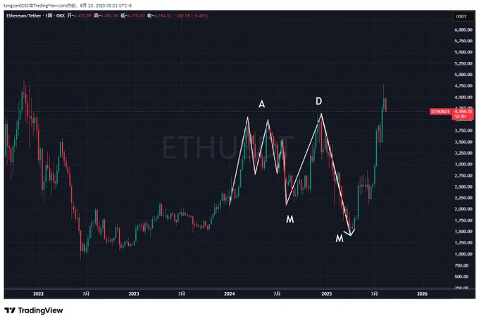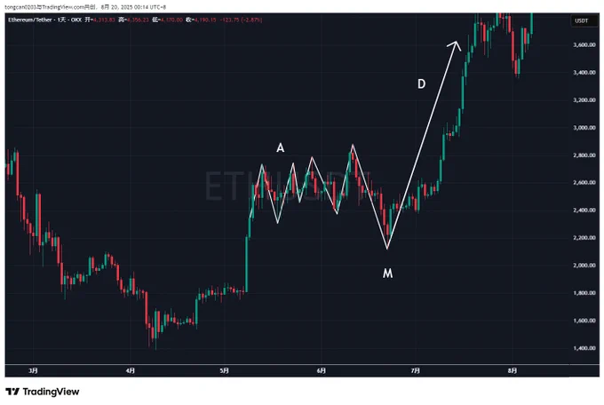 从我个人的技术层面说一下这里的【谨慎原因】,供大家参考。 一、 $BTC 【周线级别】——2B+量价持续背离+OBV持续背离+楔形跌破。如下图所示,过多的不再多说。 二、 $ETH 目前虽然很强势,但我很难不去担心它能不能抗住 $BTC 的空头压迫,继续走强。 以及,我不知道有多少人知道【AMD形态】,说句难听一点的话,这是一种机构恶意操控市场的吸筹和洗盘方式。 也是因此,这一轮牛市无数散户E卫兵和交易员都被 #ETH# 折磨到崩溃。详情见下图。 2024年初—2025年初 $ETH 先进行了一次【周线级别的AMD】,而且在D后,在牛市里又直接去打了一个非常恶劣的深度M,把散户彻底杀干吃净。 同样的方式在近期的2025年5月—2025年6月的【日线级别里】再次出现【AMD】。 接下来 $ETH 在回调期间会怎么调整洗盘,谁也不知道。 最后说一点我个人知道的消息,大家全当八卦听了。 这一轮 $BTC 和 $ETH 的主力都是华尔街的顶级操盘手(如果你觉得不存在主力操盘可以当我没说)。 懂交易和技术分析的朋友应该都能感受到,不要说散户的无助了,就算是专业交易员,都能感受到这一轮币圈行情的反复无常和捉摸不透。 最后想说下: 如果我是一个想着一味赚取流量的KOL博主,最聪明的方式就是永远唱多、喊多、分析多头趋势。 因为即便错了,我可以说一句我也赔钱了、被套了,大家都可以共情。 但我是一个想在这里真实记录和分享自己交易思路的交易员。我不能一边自己开空,一边在推特上鼓舞大家坚信回调就是机会,勇敢接多。 以上,供参考。