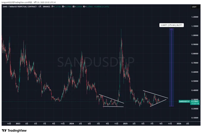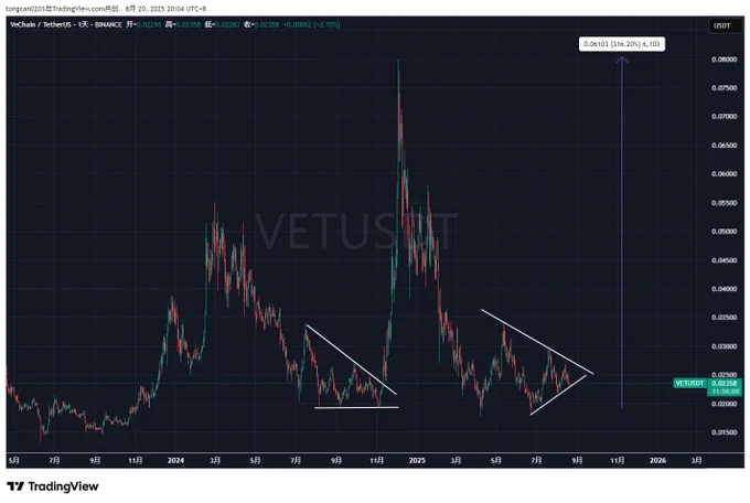 为什么前两天我和大家说:如果这次 $BTC 和 $ETH 调整完继续上攻,我们将会大概率再次迎来【山寨季或者山寨月】 不知道大家有没有发现,从今年4月份—8月份这一波的行情里,大部分跟随 $ETH 拉盘的山寨除了 $ETH 系列之外,更多的都是这一轮的各种新上的新币,妖币。 而过去的一些强庄山寨反而表现的很差,几乎没有去参与这轮行情。 随便举两个例子,比如2024年11月份那轮【山寨月】行情中表现出色的强庄公链代币 $VET 和游戏板块龙头 $SAND 这两个代币在2024年11月份那轮行情里表现出色,都是暴力拉盘。但在今年4月—8月里反而每一次波浪上涨的高点越来越低,非常让人失望。 但是它们的低点也在不断抬高,目前全都憋在三角形末端,基本处于退无可退的地步了。 类似这样的老牌强庄山寨还有不少,大家可以去找一些看下,形态都是类似的。 在盘面上,2024年11月份那轮【山寨月】发生时的信号是当时 $BTC 在2024年3月份刚刚突破上一轮高点6万9到达7万3后,就开始了长达半年之久的震荡回调,然后在2024年11月6日正式突破7万3的前高,直奔10万大关。 而当前已是这轮牛市的下半场,留给市场的时间已经不多,盘面主导也由 $ETH 开始接班。所以我个人认为,这些老牌强壮山寨都在等一个信号: 就是 $ETH 究竟能否、以及何时正式突破4870这个历史前高。当 $ETH 正式突破时,这些老牌强壮山寨大概率会再次开始发力。 所以如果你看好后市,在这个时间节点,可以找一些自己看好的老牌强壮山寨买入一些现货头仓,合约交易者可以开个0.3-1倍杠杠的仓位做底仓,因为目前这些山寨币都处在周线底部,盈亏比确实不错。 但这样自然会承担一些风险,如果你风险偏好低,可以最近对这些山寨多保持关注,一旦它们突破下降趋势线,有了更明确的启动信号,选择右侧进场。 以上,供参考。