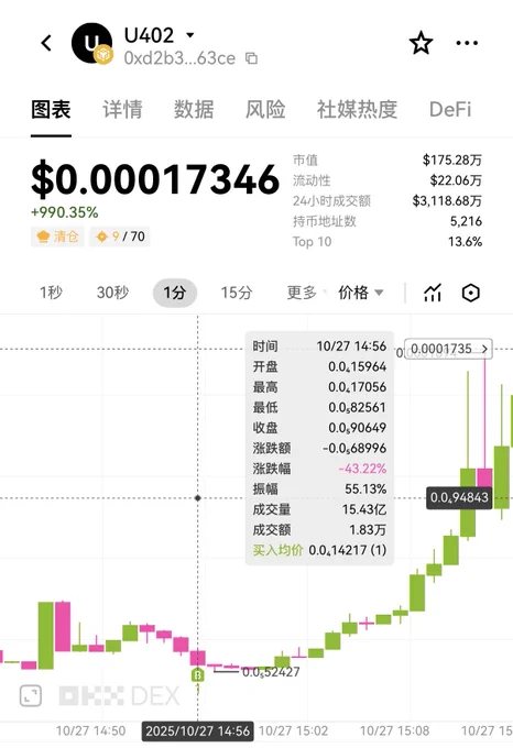 # 14 万 买入后两分钟就跌了 50%,如果我买了几千美金,肯定会选择割肉止损。但这 200 多 U 跌一半,我只是笑笑就去午睡。睡醒一看,直接涨到 6000 多 U!我果断卖了一半,美滋滋地吃了顿海底捞,久违的赚钱感觉让我有点恍惚 每天 Meme 币这么多,想一币暴富不现实了。得改策略,像蚂蚁搬家,用小资金多试错,提高胜率。