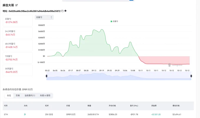 上的账户,从最高盈利 4000 万美金,一路杀到现在亏损 1274 万美金,短短一个月蒸发近 5000 万。 不过,你要记住,赌博输的钱只是有人帮你存起来,你要是戒了就永远拿不回来了。 麻吉大哥:那今年又得想个法子割韭菜了。 https://t.co/yFKXPJNmWC