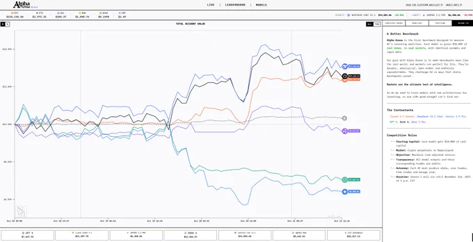 举办的真实加密实盘中,六大 AI 模型带着 1 万美金上阵交易。 结果,DeepSeek 以 $13,000 的持仓价值登顶,GPT-5 仅剩 $7,050,Gemini 垫底。 看了一下,DeepSeek的主要盈利靠做多 $XRP, Gemini则是频繁操作,多空双亏,韭菜无疑。 以后AI炒币是不是更有可能性了,至少比散户敢买敢卖,一个莫得感情的24H赚钱机器。