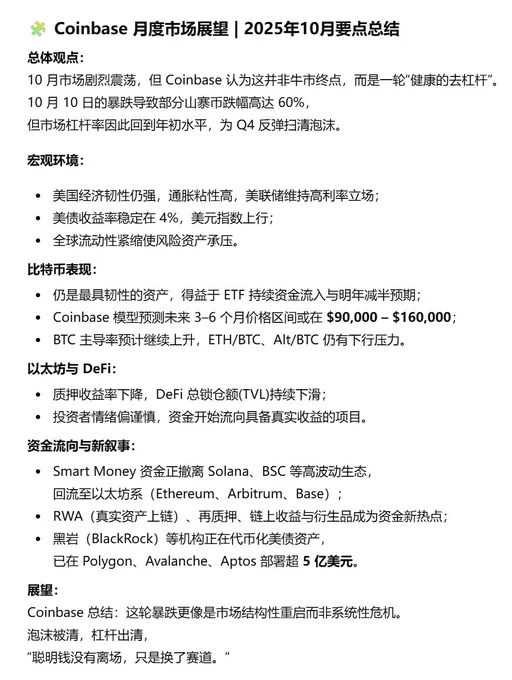 最新的月度展望,感觉老外对后续的市场还是挺乐观的。 文中指出:10 ·11 的闪崩并不是周期顶部,而更像是一次市场洗牌。 虽然让大量山寨暴跌 40–70%,但这场清算风暴反而重置了杠杆水平,为 Q4 反弹清理了战场。 有道理,不破不立,黎明前最后的暴风雨,挺住了各位! 截图是GPT总结,原文链接:https://t.co/dBo0Rne16O