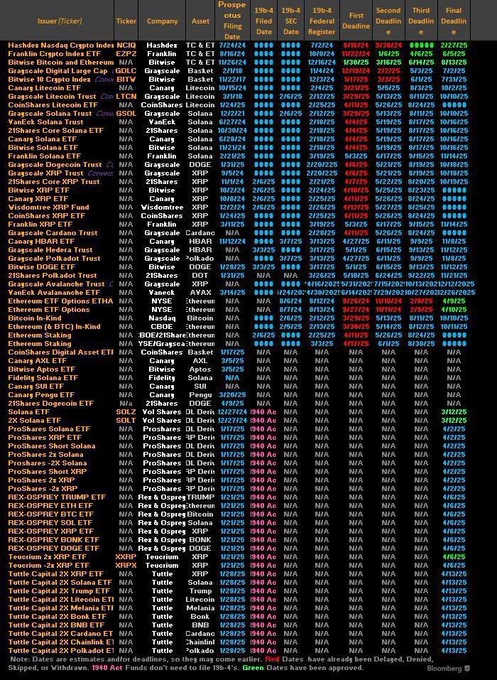 根据彭博社的报道,目前美国有 72 个和加密货币相关的 ETF 等待 SEC 的批准,其中就包括了 $SOL $XRP $DOGE $LTC $DOT $AXL $AVAE $APTOS $SUI $ADA $PENGU 以及 $BONK 的现货 ETF 申请,还有就是很多小伙伴关注的 $ETH 现货ETF 质押的申请。