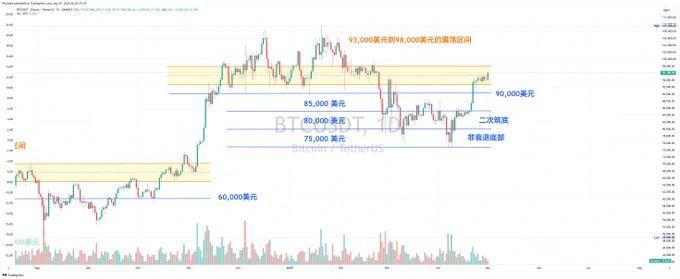 早晨还在说这个方面的事情,目前 $BTC 仍然在 93,000 美元到 98,000 美元之间的支撑区域内,几乎是三月和四月两个月的下跌都是因为 川普 的关税原因,现在在关税已经被预期威力降低后,消除了关税的影响,这也说明了 Bitcoin 的弹性要高于美股。