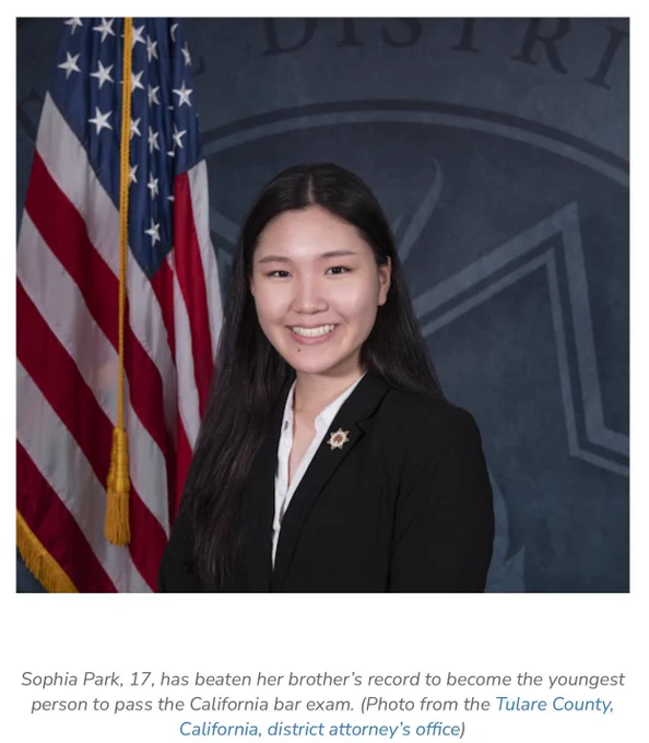 照片中这位韩裔的美国女孩,打破了她兄弟的记录,17岁零11个月通过律师执照考试,她通过执照考试的时候才17岁零8个月。