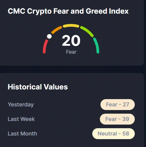 📉 今天比特币贪婪恐惧指数跌到 20,大众都在恐慌——但往往正是最佳进场区。