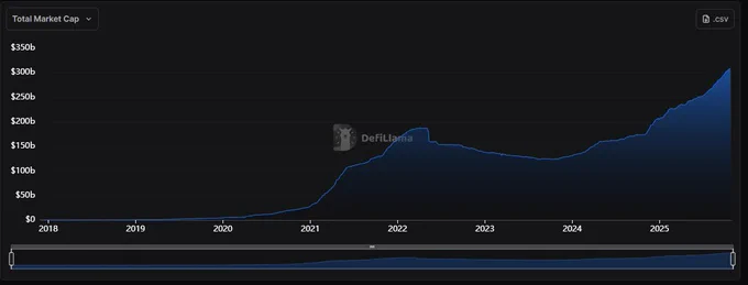 稳定币的市值成功突破了 3080亿 美元,再创历史新高,说明新资金还在往币圈流,而以往牛市减半的次年年底,币圈都会疯涨一波,虽然历史不会重演,但总是惊人的相似 https://t.co/9yKo4gAqHz