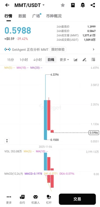 这两天看很多人在骂MMT,一看K线,这是一上线就收割,较高点跌幅超过85%了,前天上线买了没跑了,基本都被套住了,项目方吃相过于难看 #