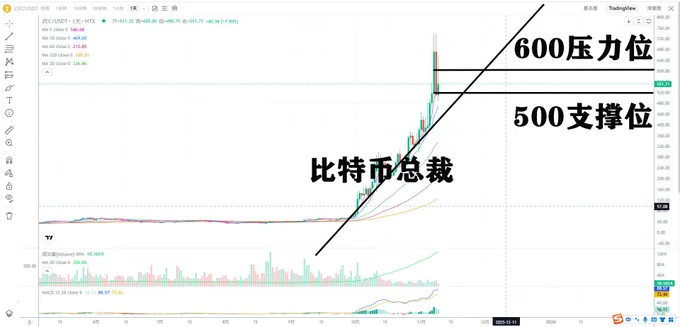 ZEC从日线级别来看,短期创出历史新高后出现冲高回落,但整体趋势依旧企稳在短期均线之上,且下方有MA10支撑,因此短期回调空间有限,顶多回调至500附近就差不多了,蓄势之后,将会继续去冲击600大关 #