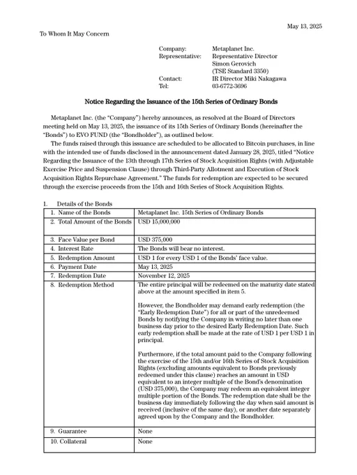 日本上市公司 Metaplanet 准备发行1500万美元的普通债券,用于购买更多的 #