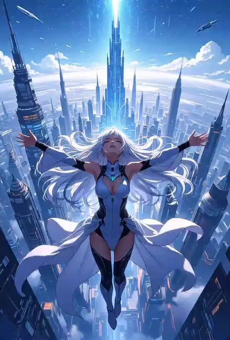 In a high-detail anime sci-fi style, an ethereal white-haired woman ascends triumphantly above a futuristic city. She has long flowing hair, a serene expression with closed eyes, wearing a sleek white bodysuit with blue accents and flowing cape, arms outstretched. The scene features towering skyscrapers, a central spire glowing with blue energy beam piercing the sky, flying vehicles, under a vast blue expanse with wispy clouds. She gently ascends, hair and cape billowing softly in the wind, energy beam pulsing faintly. Captured in a slow, stable upward pan from a low angle, evoking an epic, awe-inspiring atmosphere of triumph and wonder, with vibrant blues and glowing effects.