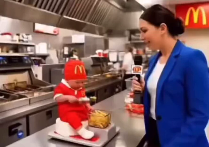 这个AI视频好玩,记者采访麦当劳工作的娃娃。