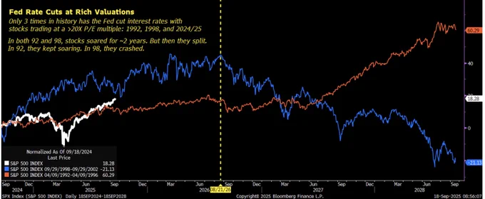 历史上联储在市盈率超20倍时降息,只有两个先例: