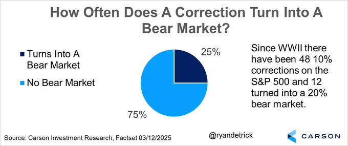 自二战以来,标普有48次的10%向下调整,其中只有12次最后进一步演变成熊市。 https://t.co/lVL6UlpR4L