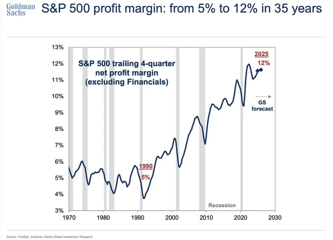 标普公司的平均利润率从1970年的5%,上升到如今的12%。