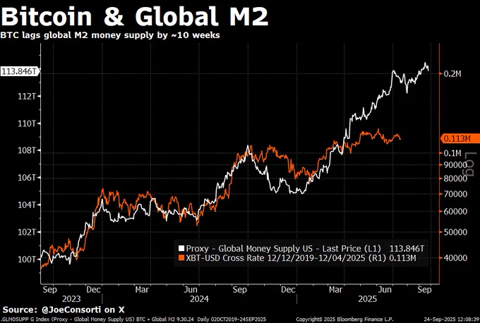 但是自5月初以来,比特币和全球M2脱钩,滞后约70 天。