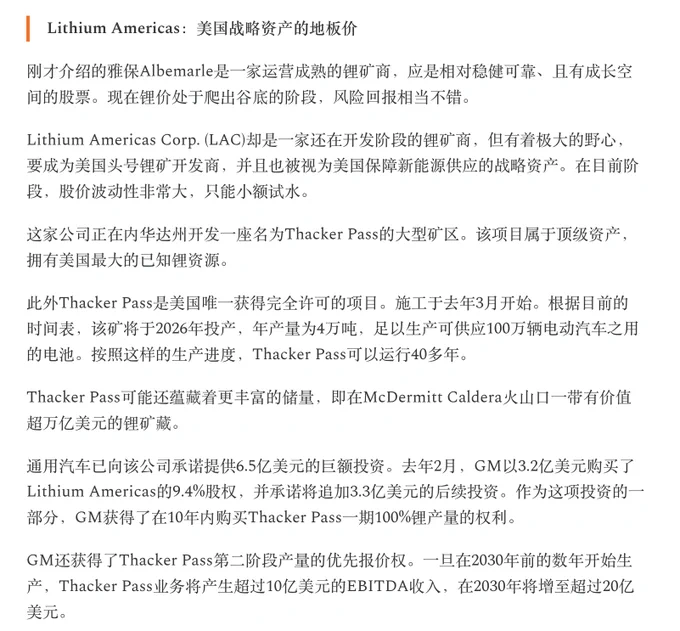 Lithium Americas我去年5月9日写的文章《锂价复苏中,抓紧买入2个锂矿股》就提到了,这一战略资产对于美国确保关键金属供应链的目标至关重要。美国政府乐观其成,并且会全力加以扶持。