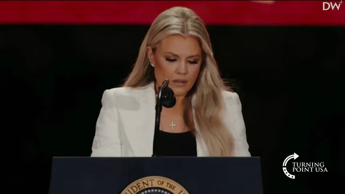 感谢你们从世界各地来到这里,以纪念和庆祝我的查理。就在离这里几英里的地方,两年前的2023年美国节,查理在我们TP USA Faith活动中发表了一场演讲。查理喜欢即兴演讲,他非常擅长不带讲稿地表达。所以我个人并不知道他会说些什么。那天他选择谈论的是他对上帝旨意的顺服。他引用了他最喜欢的圣经经文之一,以赛亚书6:8:“主啊,我在这里,请差遣我。”