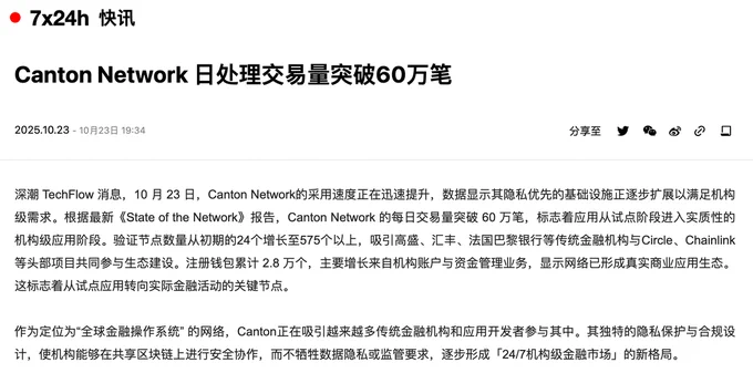 现在链上日处理的交易量差不多 60w笔,验证节点从 27 到现在的575,而且已经有 120 亿美元的监管级资产在canton上原生发型,主要是一些债券/货币基金/大宗/保险这些东西。