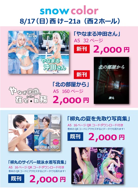 # お品書きできました! 2日目8/17日曜日 西地区 “け”ブロック-21a (西2ホール) サークル『snow color」 当日参加モデルは柳丸さんです✨