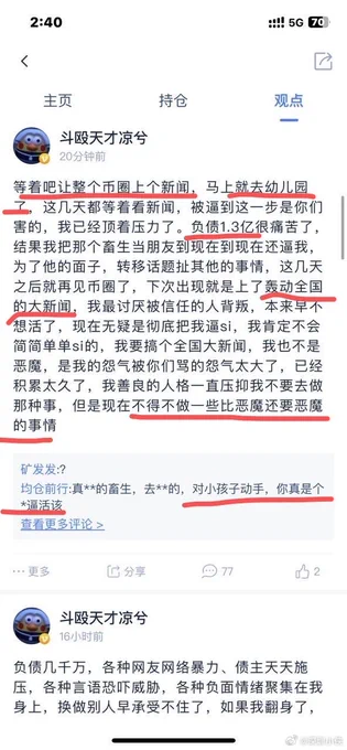 我跟凉兮对线了4年,我很了解他,我可以确定他没有团队,这就是他最真实的风格。 我觉得他与其他任何人最大的不同就是,它来币圈并不是为了挣钱的,他更多是通过挣钱去证明自己,证明自己很牛逼,然后实现它心目中一些它认为特别重要,了不起的事情,所以它不去做返佣,有钱了也不会接任何广告,因为如果这么做,就证明不了自己牛逼。 (源于原生家庭和成长经历,从小被霸凌,不被家人重视) 就是因为他是这样的人,所以特别能整活,它属于是先天网红圣体,我比他差远了,我来币圈,目的非常简单,就是为了改变命运,挣钱,无它~ 我第一次认识他的时候就知道他的特点,所以他是顶流当之无愧。 它有钱的时候道貌岸然,喜欢站在道德高地指点江山,人还特别好面子。 他有钱的时候宣称自己从不接任何交易所的广告,但它自己每天晒单,极度煽动性的炫耀/彰显自己通过合约百倍杠杆,一天几百倍收益,无数不明真相的韭菜争相模仿,是间接导致无数韭菜家破人亡的罪魁祸首。 没钱的时候毫无底线,接任何垃圾广告,肮脏的事情都干,口口声声给人承诺翻身几倍返还,其实大部分人并没有收到赔付,亏到心态不好的时候,还要扬言去幼儿园做惊天动地的大事。 综上所述,我对它总体评价,还是垃圾人一个,合约就是赌,没有技术可言,它给币圈带来的娱乐效果大于实际上的意义。