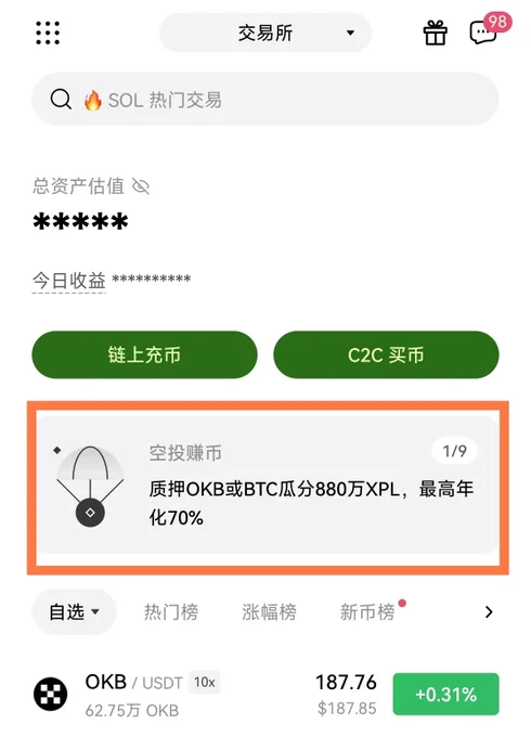 XPL这两天很出圈,新币中的黑马 OKX用户免费撸空投↓↓↓ 今天跟大家主要介绍一下『空投赚币』 #空投赚币# 已经来到了第二期 质押币种新增了OKX的平台币 $OKB 年化高达60%以上,高于其他币种 目前支持的币种OKB,BTC,USDT 你的质押收益为:质押币种➕新币空投 新币上线时,不用再焦虑不安,怕错失良机 不用自己买,只要你质押以上币种 欧意给你空投新币(优质项目才给上空投赚币) 注意:每个用户最多可以质押500枚OKB 操作流程:打开OKX app 首页的公告栏,点击空投赚币,选择你要质押的币种进行申购就可以了 本期活动的时间为9.25——10.02 新币XPL奖池为8800000枚 纯保本理财产品,冲! OKX Web3钱包返佣码:YTFLZ