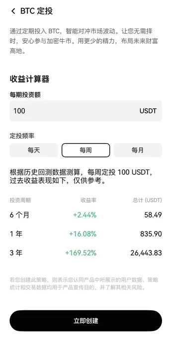 在实物投资上 我每年会购买1000g的金条 目前跑赢了房产的投资 在数字资产领域 也在培养自己“定投”的习惯 数字资产中能和黄金比肩的就是 $BTC 想开始定投,又想一键化托管 OKX的【定投策略】产品你一定需要他 如果你每周定投100U的BTC 会有超过实体黄金的收益率 (根据历史回测数据) #OKX# 六个月的收益率吊打所有银行的定期存款利率,收益率为2.44%,收益额58.49💲 一年的收益率跑赢了国内主流股票的平均收益率,收益率为16.08%,收益额为835.9💲 三年的收益率对比硬通货“黄金”的收益率,领先两倍有余(黄金77%),收益率为169.52%,收益额为26443.83 这仅仅是每周定投100💲的回报 各位A8,A9的老板如果用这个定投策略,无限复利,以钱生钱,无穷尽矣 非常稳健且高效的理财策略产品 高本金高复利,低本金也可以享受慢慢积攒的过程,积沙成塔,积少成多 可以每天、每周、每月、甚至没小时 每笔交易大于2💲就可以 积累财富最好的时机就是现在 @okxchinese